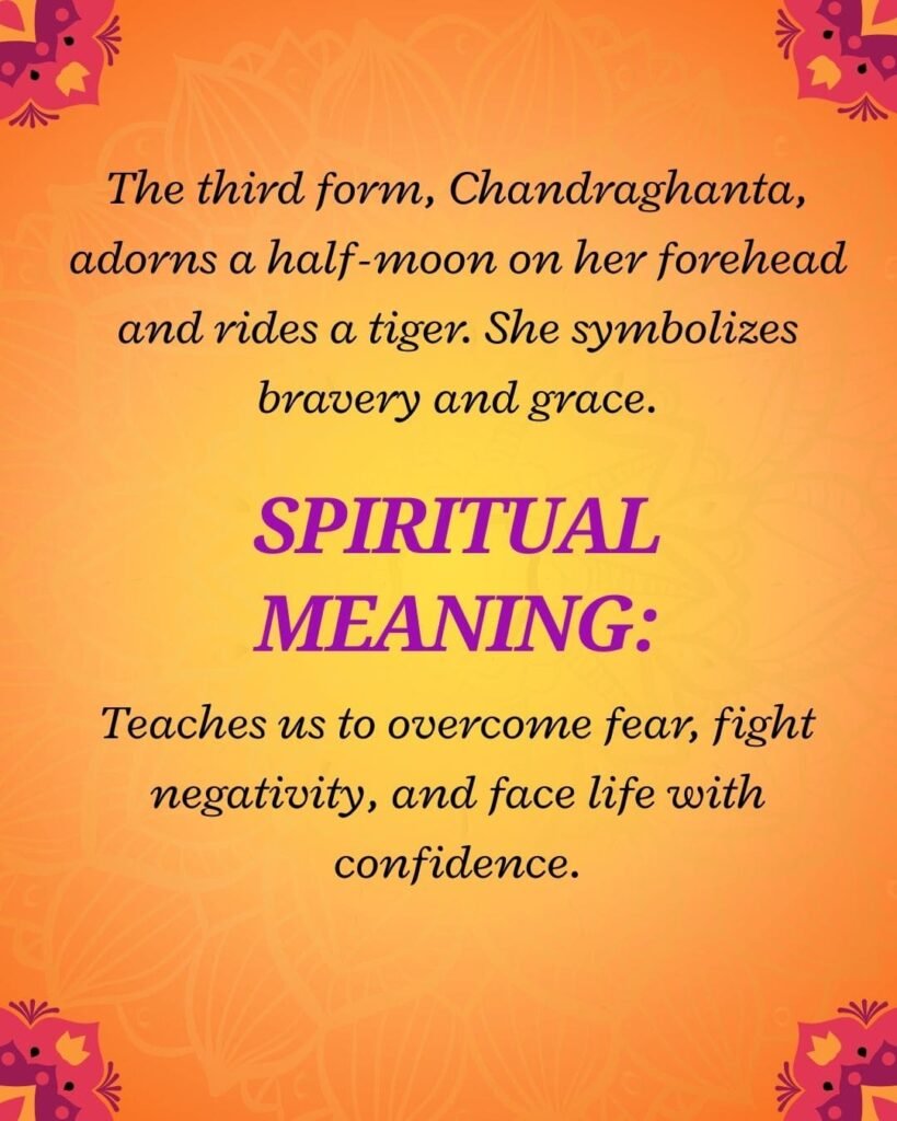 The third form, Chandraghanta, adorns a half-moon on her forehead and rides a tiger. She symbolizes bravery and grace.