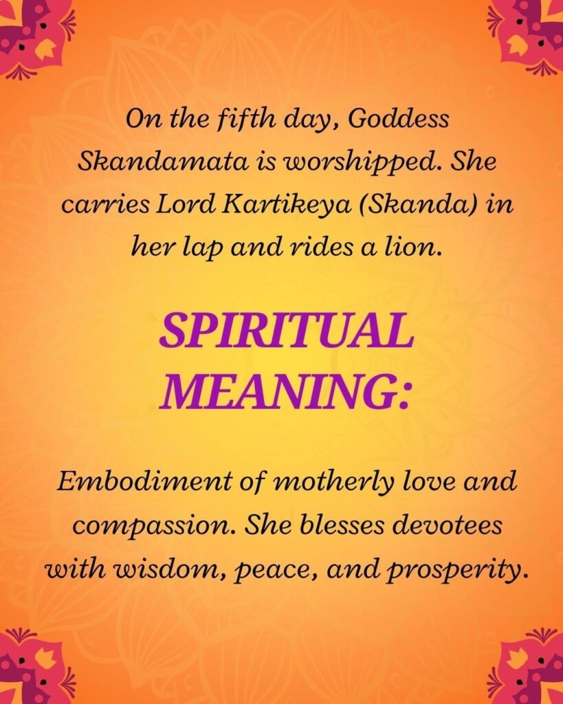On the fifth day, Goddess Skandamata is worshipped. She carries Lord Kartikeya (Skanda) in her lap and rides a lion.